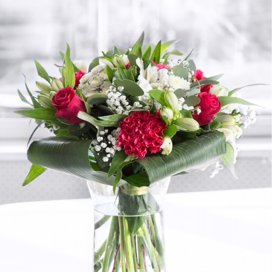 The white alstroemeria and carnations created a lovely contrast. Beautiful bouquet.