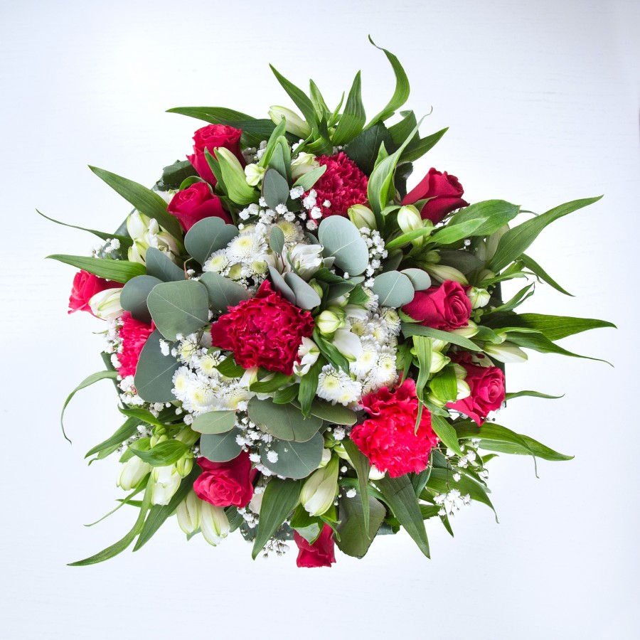 Brighten any space with our radiant flower arrangement, featuring a stunning combination of vivid red roses and crisp white chrysanthemums. Accented with gypsophila and enriched by white alstroemeria and aspidistra leaves, this bouquet is a true celebration of color and elegance.